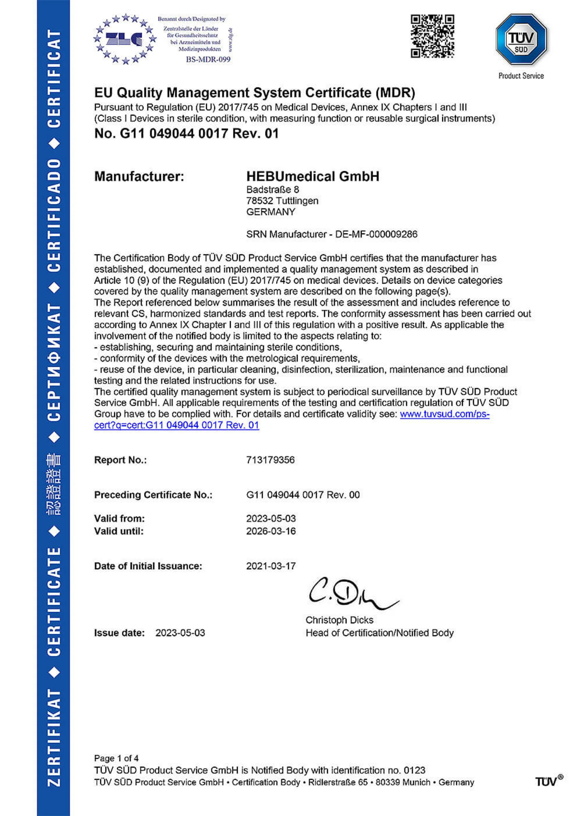 Durch ein umfassendes Qualitätsmanagementsystem stellen wir sicher, dass bei uns an jedem Arbeitsplatz Qualität produziert wird, vom Beginn der Fertigungskette bis hin zur Endkontrolle. Wir sind zertifiziert nach DIN EN ISO 13485:2021 und der EG-Richtlinie 93/42/EWG.