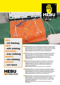 NEU NEW NOUVEAU NUEVO NUOVO - mit Sidebag - with sidebag - avec sidebag - con sidebag - con tasca HEBU insta-hold ist eine revolutionäre Entwicklung die für jeden Operateur eine Erleichterung durch ein neues Maß an Sicherheit und Komfort bietet. HEBU insta-hold ist eine nicht magnetische, rutschfeste Matte, welche hilft, dass Instrumente im Operationsumfeld nicht wegrutschen können. HEBU insta-hold hält die Instrumente ohne sie zu magnetisieren. HEBU insta-hold is a revolutionary development designed to simplify the task of every surgeon with a new dimension in safety and convenience. HEBU insta-hold is a non-magnetic slip-proof mat which helps prevent slippage of instruments in the operating theatre environment. HEBU insta-hold reliably secures instruments in position without magnetizing them. HEBU insta-hold est un développement révolutionnaire qui apporte au chirurgien une simplification grâce à une sécurité et un confort revus. HEBU insta-hold est un tapis non magnétique et anti-dérapant, qui contribue à ce que les instruments ne puissent pas déraper dans l'environnement opératoire. HEBU insta-hold maintient les instruments sans les magnétiser. HEBU insta-hold es un desarrollo revolucionario que facilita el trabajo a cada operador gracias a una nueva dimensión de seguridad y confort. HEBU insta-hold es una esterilla no magnética antideslizante que ayuda a que los instrumentos no se deslicen en el entorno de la operación. HEBU insta-hold sujeta los instrumentos sin magnetizarlos. HEBU insta-hold è un'evoluzione rivoluzionaria, che facilita il lavoro in sala operatoria, grazie ai nuovi standard di maneggevolezza e sicurezza. HEBU insta-hold è un tappeto a-magnetico, anti-scivolo che permette il posizionamento degli strumenti sul campo operatorio, impedendo ogni spostamento indesiderato. HEBU insta-hold fissa gli strumenti nella posizione richiesta senza magnetizzarli. insta-hold