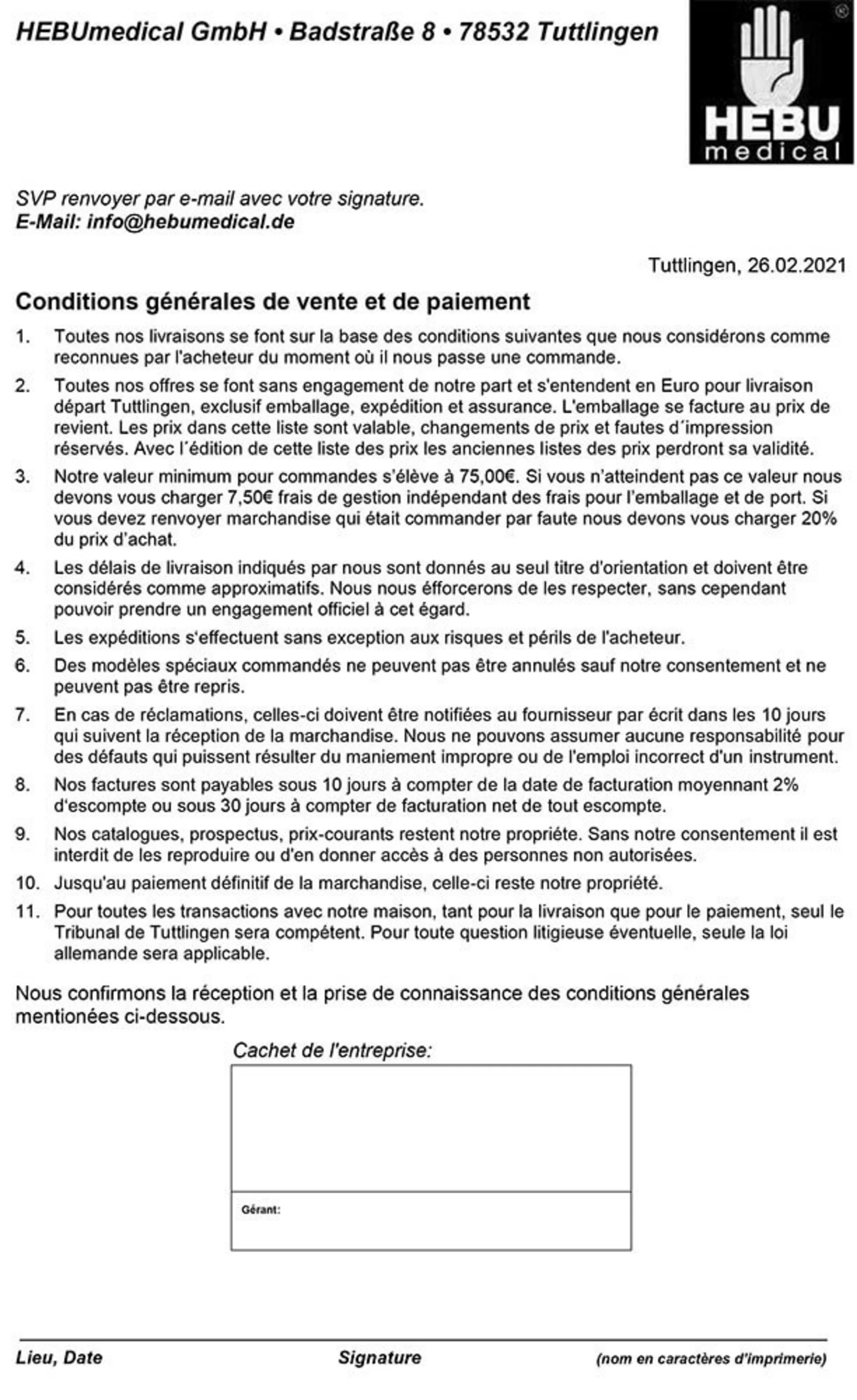 - Pour toutes les transactions avec notre maison, tant pour la livraison que pour le paiement, seul le Tribunal de Tuttlingen sera compétent. Pour toute question litigieuse éventuelle, seule la loi allemande sera applicable.